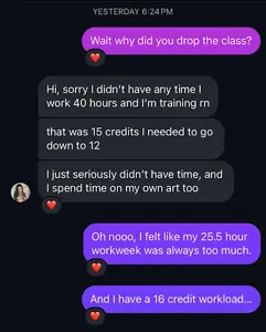 February 10th, 2025: Dry mouths suck, I woke up with one but I just drank water, I saw the message that I got from Angela about drinking water and I texted her about not doing that, she said I was gonna have to deal with the hangover but I didn't really experience a hangover. Breakfast was a toasted s'more flavored pop tart. I did work on my art class project for like an hour before I had to go to my first class. I texted Angela a bit more when I mentioned her last name, she was surprised that I even remembered that despite being pretty drunk, I found out from her that she has a dog named Bert, her favorite musician is Tchaikovsky, she got a very good grade on her German class, her birthday is May 20th, and she was a former theatre kid. I leave my second class early because of no friends when I got a text from Lizzo saying: