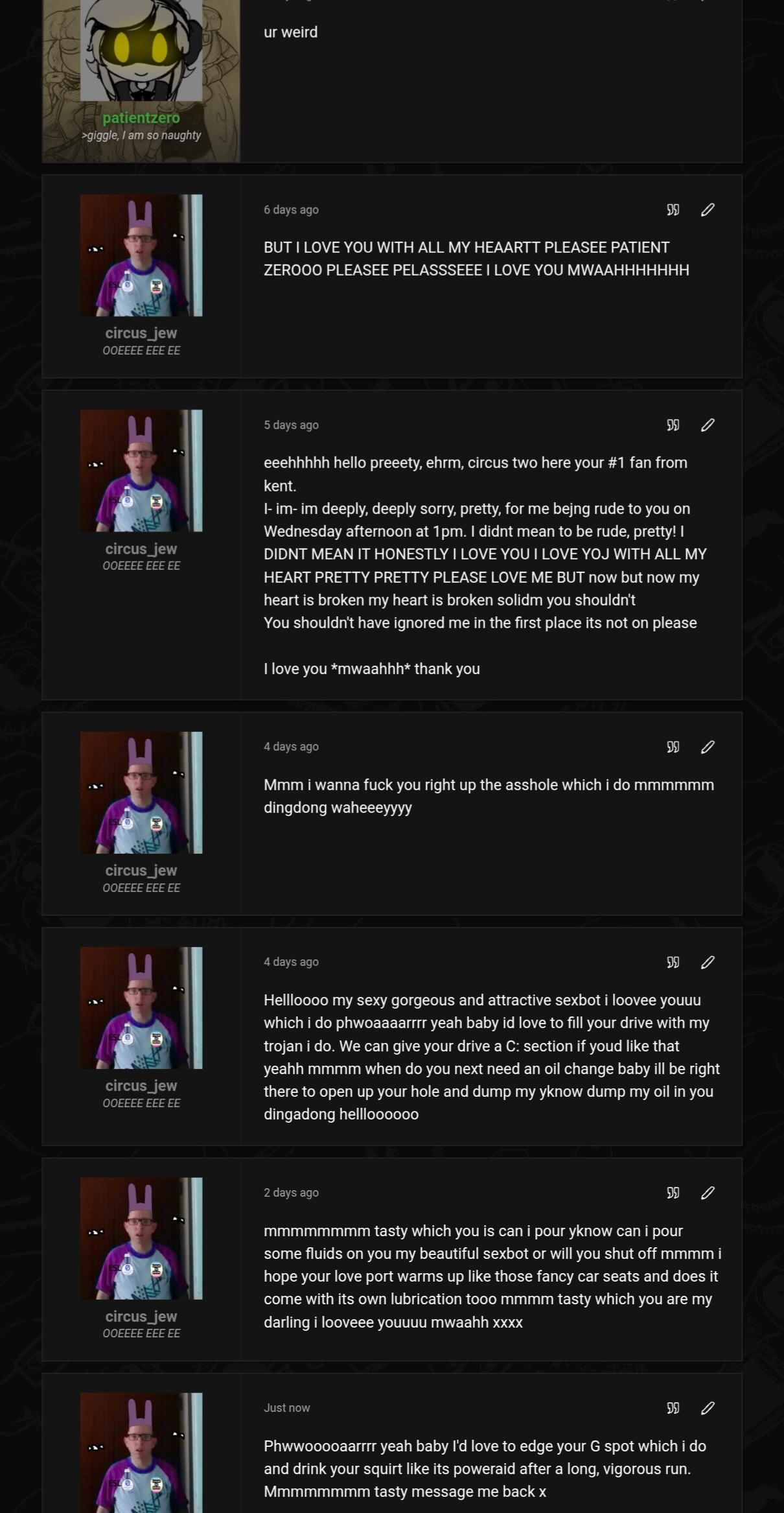 Ive made you tadc art, gave you merch, tried to ERP with you and even sent nudes, but why bother when you never send me one back? Honestly, i just want to be happy; someone out there needs to make me feel happy! Someone, out there. now come on. Honestly. What's the matter with women honestly? I've tried several attempts, but noooooooooo no you never replied, EVERY SINGLE BLOODY TIME. I fucking give up what's the fucking point, honestly. Such busy, anyway. Its not on