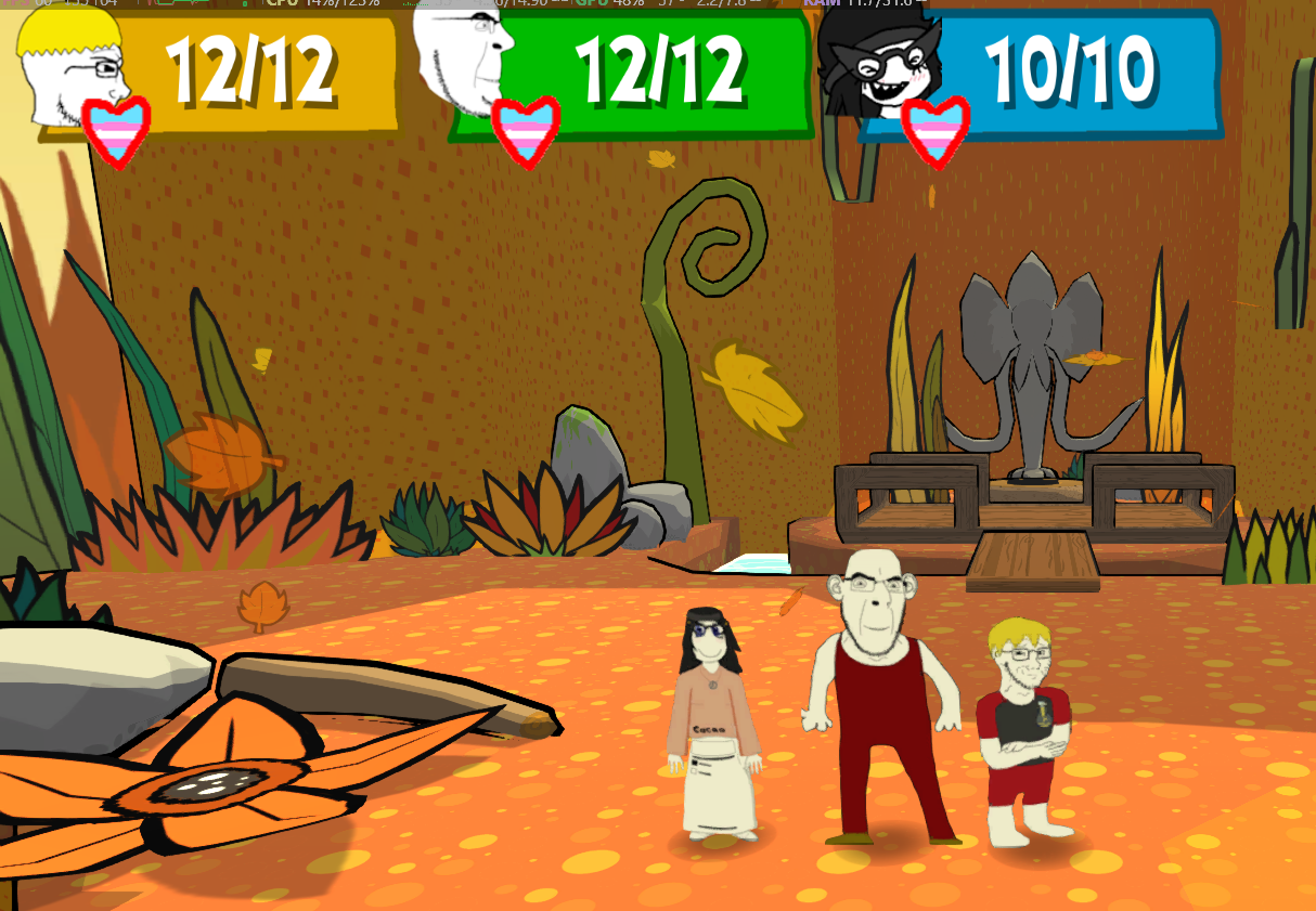 Hm, wouldn't it be kind of hard to animate Gigachad in a 2D game?@ploopy @PuertoRican I was thinking that should I change Cobson and Soytan to maybe Gigachad and Pepe?