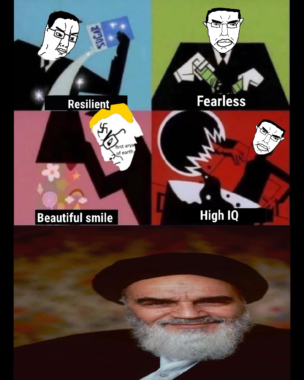 Khomeini, the supreme leader who was conceived by a cow and a donkey.