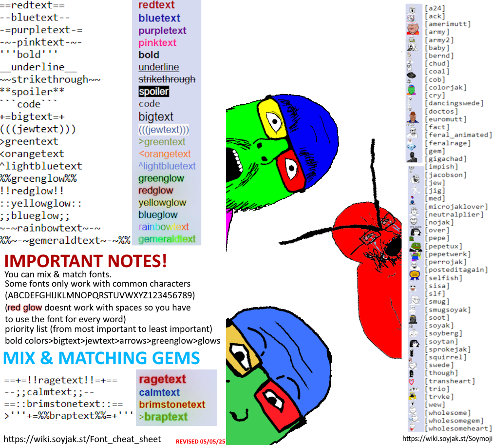@Chud: thats a bummer, is there a guide for soybooru text formatting somewhere? a recent one preferrably, i checked the cheat sheet wiki page AND the booru wiki page and there doesnt seem to be anything that tells me how to make text big