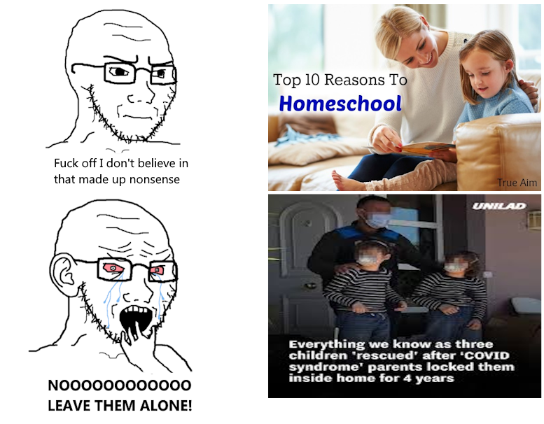 @Teasuck: It represents the irony of a numale's bias for one thing and bias against a similar thing because he still supports having a lockdown but doesn't support homeschooling