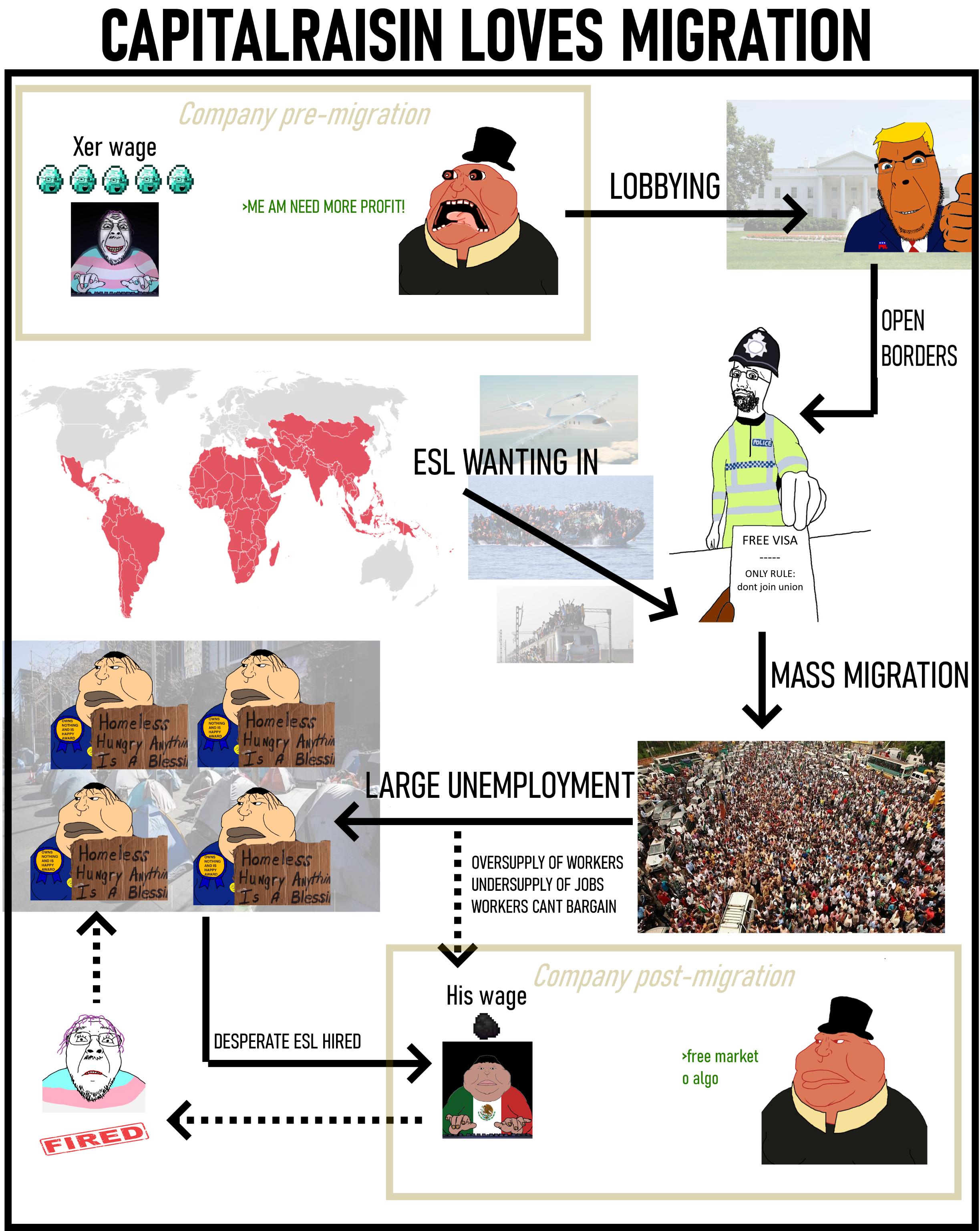 migration isn't the problem, capital is. bosses want a huge desperate labor pool so wages stay low and unions stay weak. migrants and locals are played against each other while capital moves freely and profits. workers fight workers, owners win. same scam, new border.