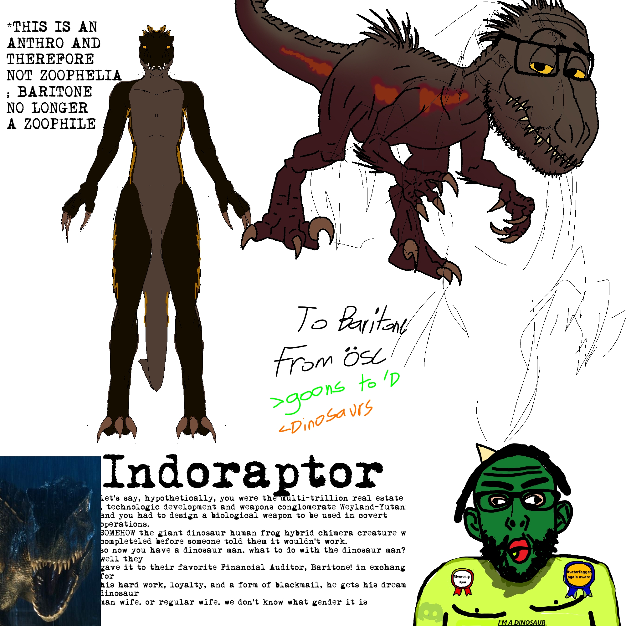 Baritone's excuse that xe isn't a zoophile is that dinosaurs are extinct