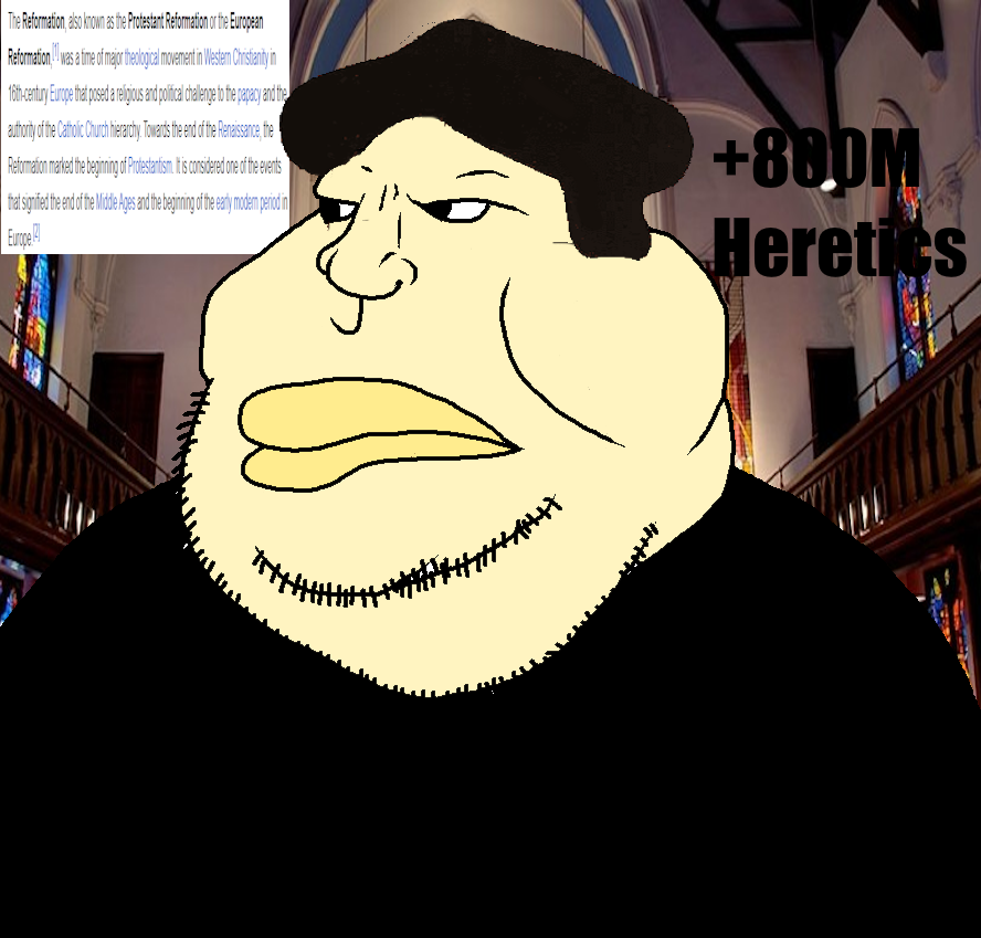 Image Views:10 Uploader Who_Let_My_BVLL_OUT, January 11, 2026; 03:44 Tags black_clothing christianity church closed_mouth heresy looking_to_the_left martin_luther protestant text variant:meximutt wikipedia Source OC Locked No Approved by emerald Rating IAS Prev | Index | Next Comments Who_Let_My_BVLL_OUT January 11, 2026; 03:45 - Reply (i'm not a catholic btw if my profile didnt make it obvious) Chud1 January 11, 2026; 03:46 - Reply >No more icon Brazilian_Chud January 11, 2026; 03:46 - Reply gem Chud2 January 11, 2026; 03:46 - Reply >No more icons oder so Chud3 January 11, 2026; 03:46 - Reply coal Who_Let_My_BVLL_OUT January 11, 2026; 03:50 - Reply @Chud: https://www.youtube.com/watch?v=qyPhsFxnc_c&list=RDqyPhsFxnc_c&start_radio=1 Chud4 January 11, 2026; 03:50 - Reply Brimcoalantimattervantablacksngualirtyantimayyrt Commenting Comment Formatting Options Want to report a comment? Report the post itself with relevant details. Link to Post BBCode Link Thumb File HTML Link Thumb File Plain Text Link Thumb File