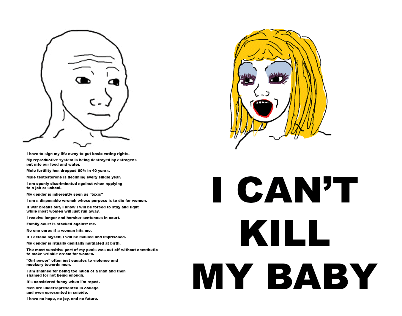 @ConservativeWaluigi: I thought the meme meant that the man says the reasons why she should abort her male baby because men suffer a lot, but she refuses to, saying she can't do this
