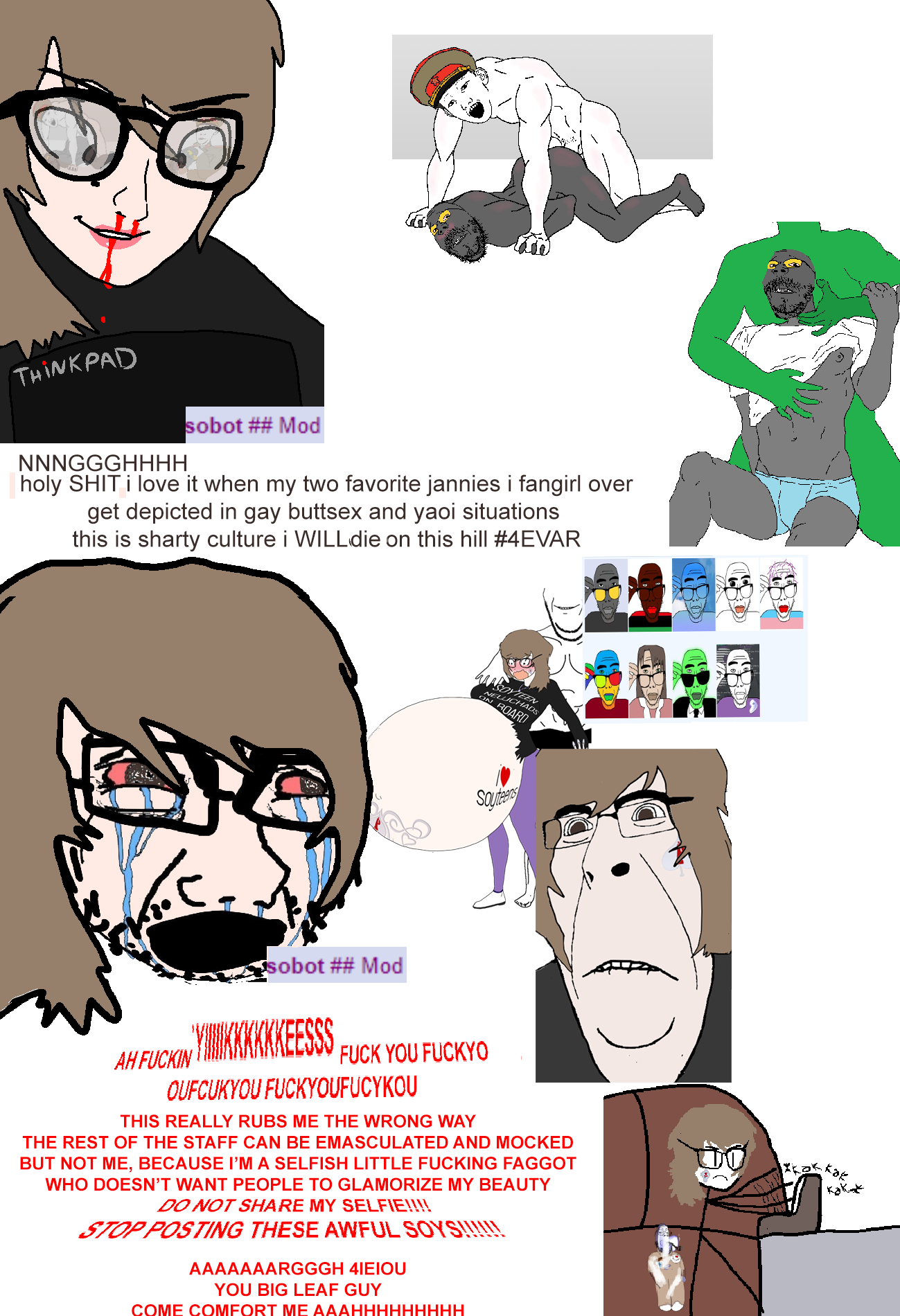 Fun fact: every namefag on the sharty has ultimately been banished, doxxed or bullied out of the site. The same awaits sobot even if he's a mod, he will eventually get buck broken, it's just a matter of time for the incels to make enough shitty edits of him to get under the skin.