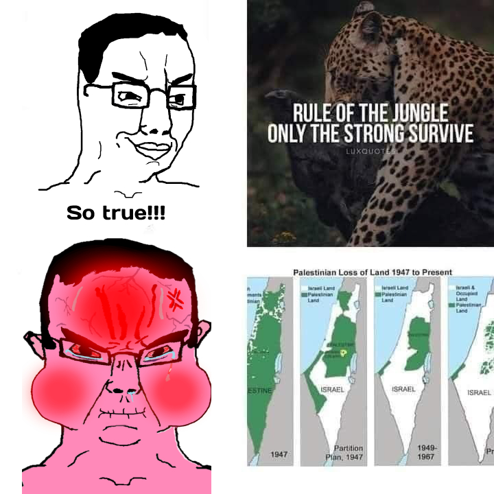 This image implies chuds would be justified in killing all jews and taking over their land, as that would make them the strong ones in the jungle. Therefore Hitler was right.