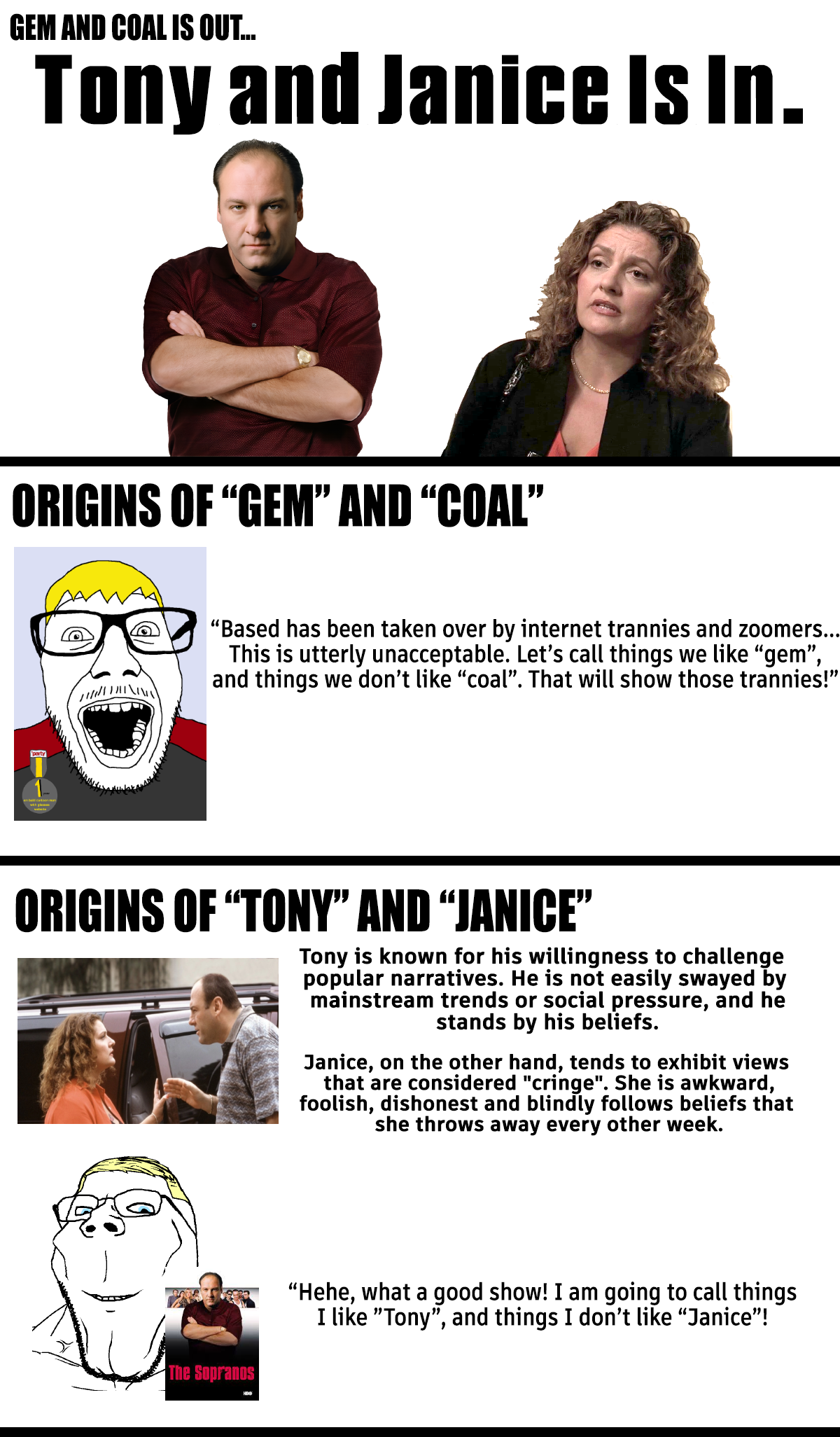 Tony Soprano always imagines himself as the modern John Wayne, the "strong, silent type", but in reality he is an impulsive selfish hypocrite, a narcissist and a sociopath who - just as Kupferberg said - did not improve at all after 7 years of therapy, and instead used his therapy sessions as a way to feel good about himself by whining about his problems, justifying his horrible actions and blaming everything on other people. All of his masculinity is a show off, he doesn't have the personality of John Wayne, he is a worse version of Janice with a penis. He revels in other people's misery, the greatest example of that being the scene where we find out that Janice had actually improved significantly after taking an anger management class and Tony, instead of being happy for her, starts just randomly brining up her son for no reason at all just to piss her off and see her lose temper again. He is the exact opposite of John Wayne, he is a narcissistic whiney little bitch ass douchebag trapped in the body of a 6'1" mafia boss. And the worst part is that this is literally the whole point of the Sopranos and everybody understood that in 2007, but zoomers are so sissified and braindead that they actually see these "men" who show ZERO masculine characteristics like Tony Soprano and Patrick Bateman as "chad sigma masculine alpha males".