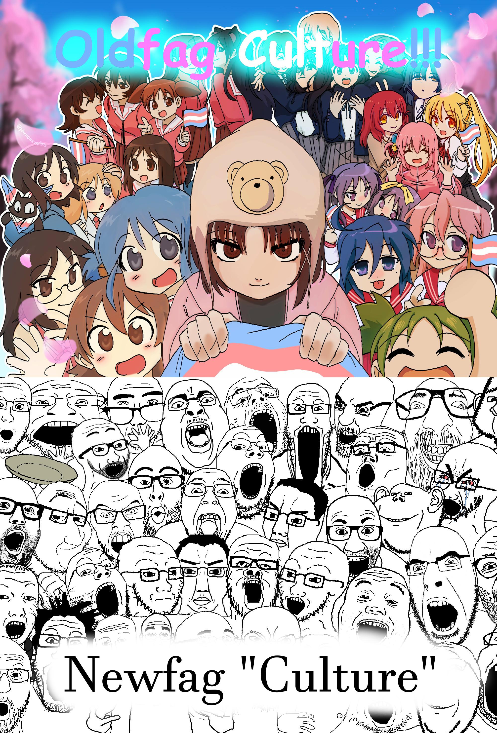 The top panel here represents an appropriation of oldfag culture in order to bolster trans validity. The same people who were 'ironically' posting 'as' these anime girls back when they were little eggs (uwu) have now shed the irony and embraced the aesthetic. Why? Because it represents an escape from the reality of Never Being A Woman. Being able to be a perpetually young anime girl is the most common trans fantasy ever and most of the ones who ack do so because of the growing dissonance between their ageing, realistic bodies and the impossible cartoons they idolize.