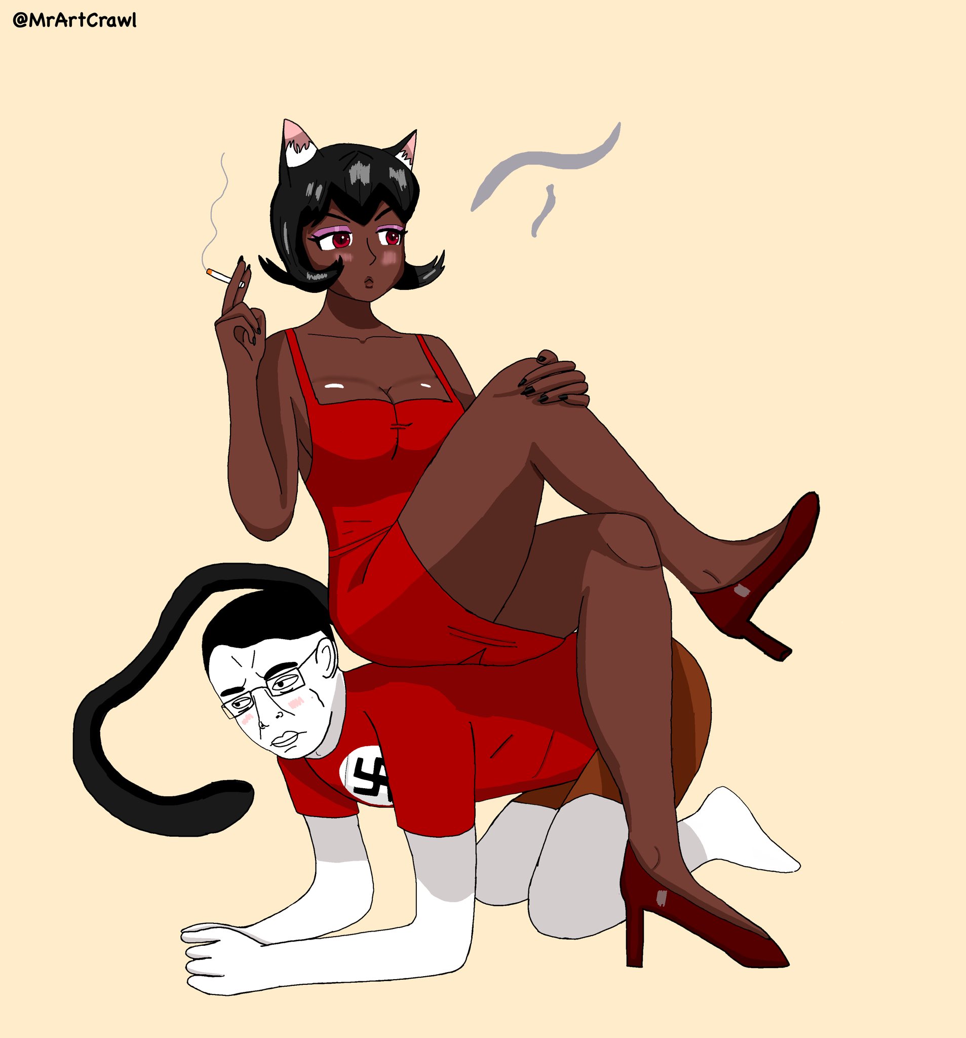 Black catgirl sitting on Chudjak with nazi t-shirt