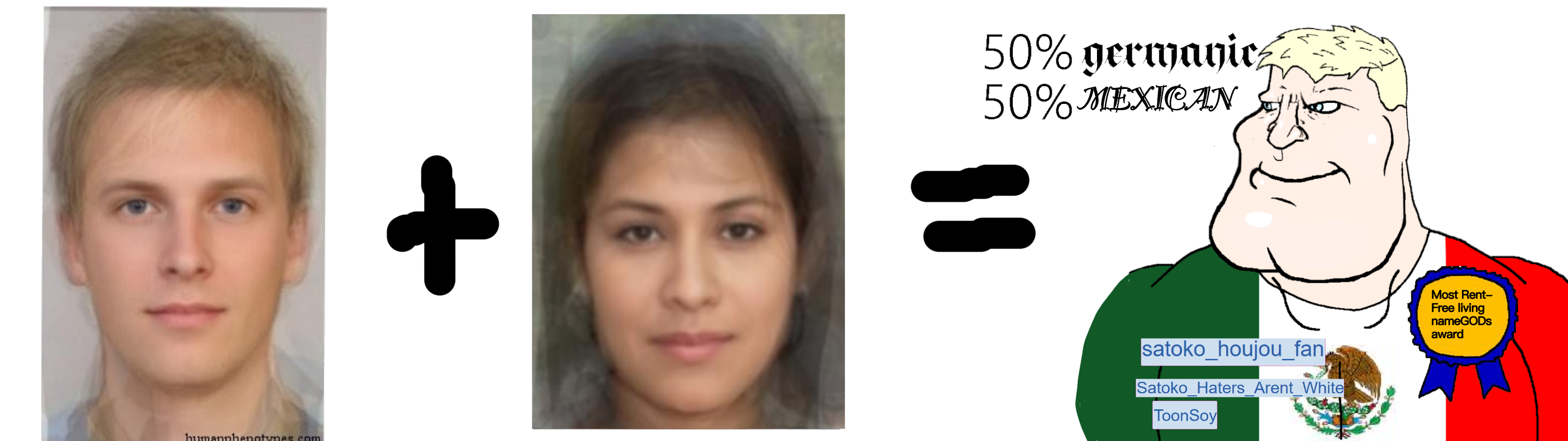 Yeah, 50% germanic and 50% mexican(27% indigenous anerican(native american) and 23% southern european(specifically, principally, specially and very mostly spaniard)) aldoe