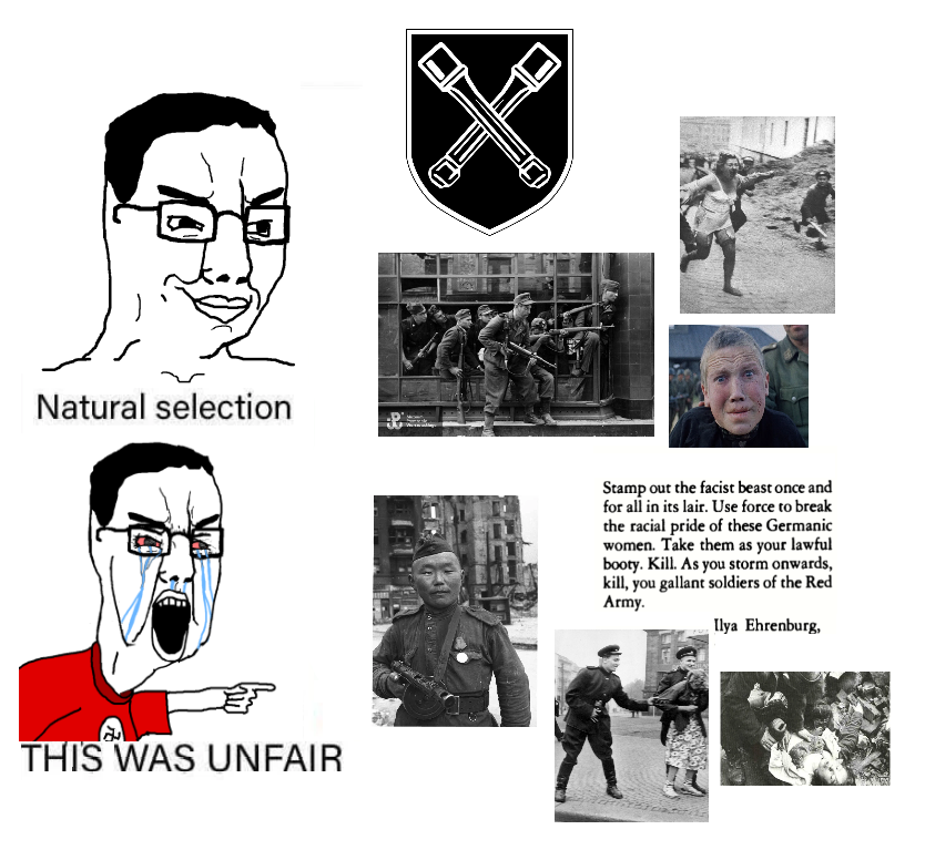 @Chud: no you failed to understand his point, the meme is already falacious because it is focusing on only one group of the whole nsdap army, and everyone in the nsdap and ss condemned their actions and were agaisnt it, you fail to understand that actual modern day national socialists (not neo nazis, huge difference) dont approve of the actions of both sides, on top of that the red army rape wasnt done on a small scale, and wasn't exclusive to a single group and was done to harmless civilians after the other side of the war was clearly on the verge of losing and weak, this is considiring everything said about the brigade is true and not overexagurated just like the holohoax