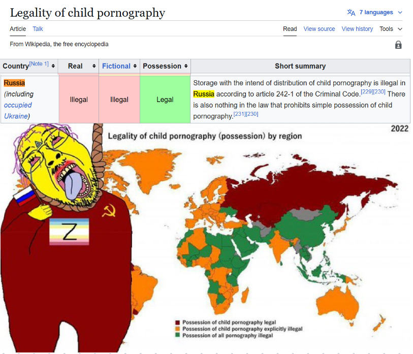 It is illegal in russia, but it goes by what the constitutions say on the legality. In russia it's not officially mentioned but unofficially CP is illegal.