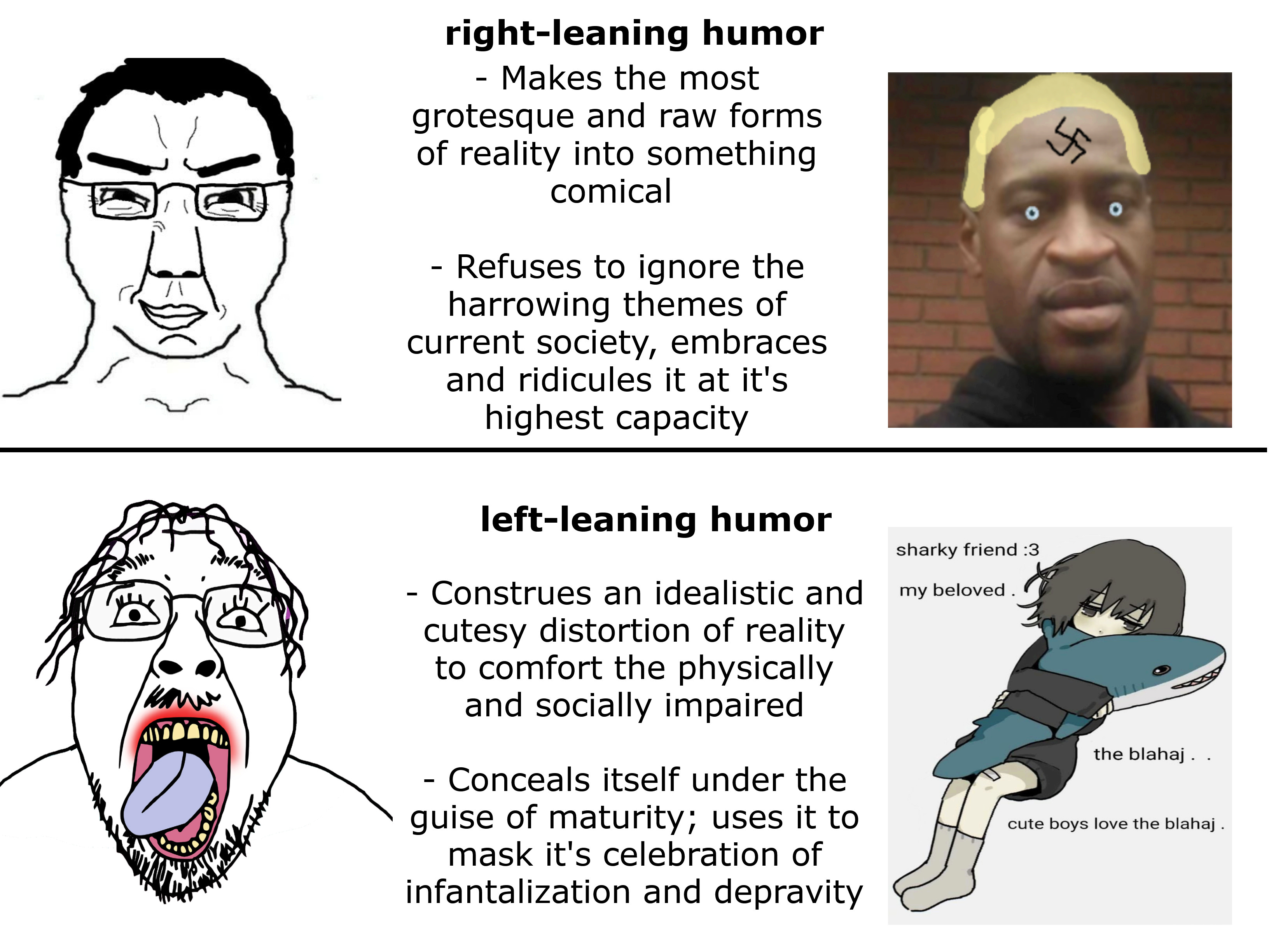 You will never see a leftist self-inserting as troon or soyjak, but you will often see a right wingers self inserting as chud, and not even the chad chud variants. Just chud. Because we can take a joke, while the woke left has very fragile egos especially troons